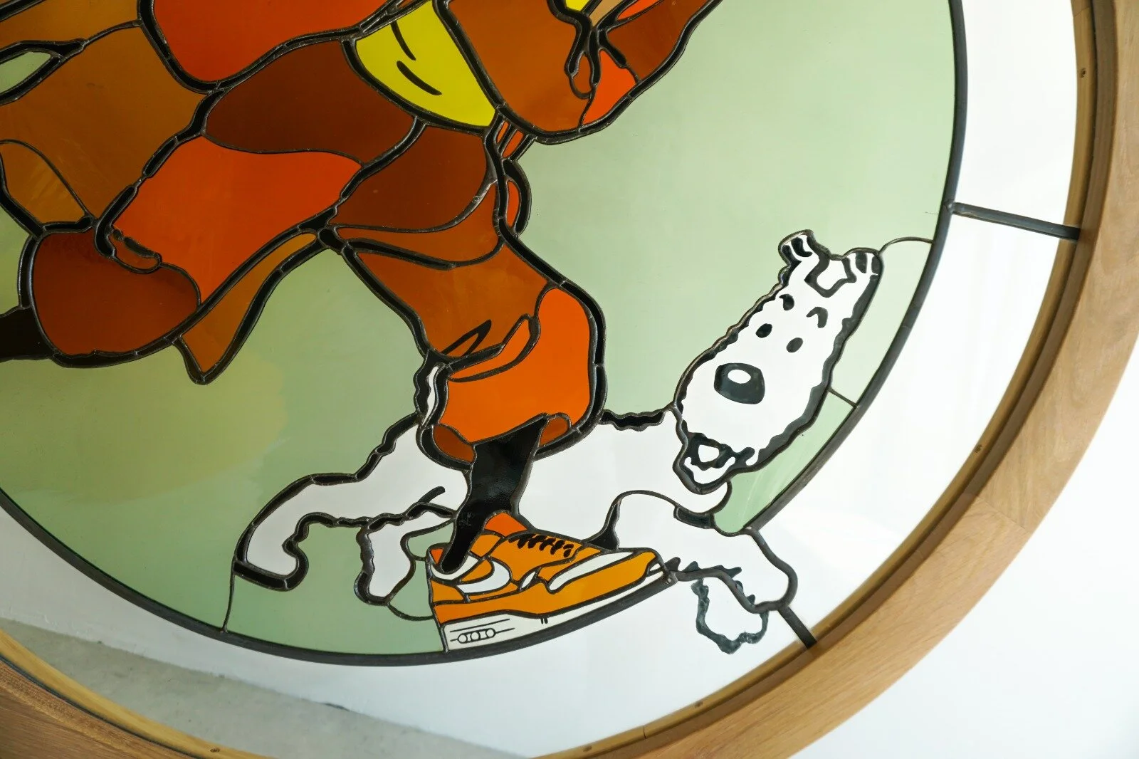 In the latest addition to ‘Parachutes’ we find two icons from two different centuries colliding in a new setting, telling a new story. It shows how icons and iconography may have shifted in time.. While celebrating nostalgia with both Tin Tin and Snowy (Milou) and the classic Nike Air max 1. A great and collectible art piece for enthusiasts of modern art, Tin Tin, sneakers, Nike Air Max and for those who can appreciate the delicate and hard labour of the traditional craft of stained glass.